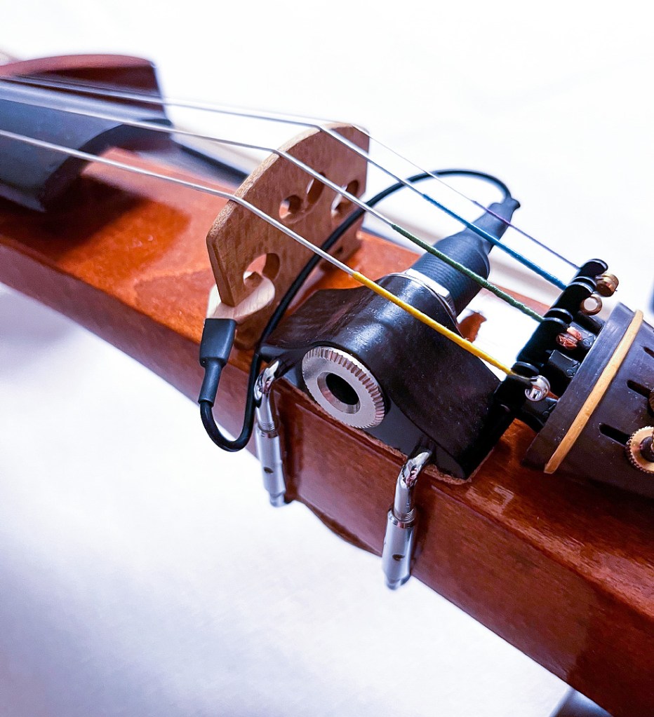 I started searching for the perfect shape, and I made a design that would fit my chinrest, shoulder rest, and the type of microphone that I like to use, as well as the shape that would correspond to the same feeling as playing on the acoustic violin.